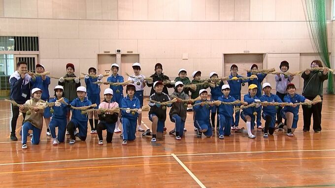 しめ縄づくりの体験は、伝統文化の継承をと企画されたもので、善通寺市の吉原小学校の児童と保護者、約50人が参加しました。地域の人から指導を受けながら稲わらをより合わせていきます。昔は各家庭で作っていましたが、多くの児童にとっては初めての体験です。
