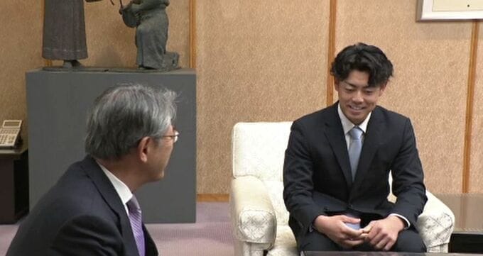 田村敏和市長は「阪神はことし、リーグ優勝したチーム。次は日本一を目指すうえで、まずはケガをしない体を作ってほしい」と、谷端選手を激励しました。
