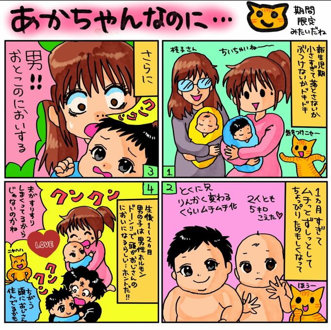 中川さんは、赤ちゃんから早くも「男!! おとこのにおいする」と明かしています。さらに、「生後1〜2ヵ月 男の子は男性ホルモン ドーン!!で頭がおじさんのにおいになるらしい… ホントだ!!」と、自身の率直な感想をユーモラスに表現しています。