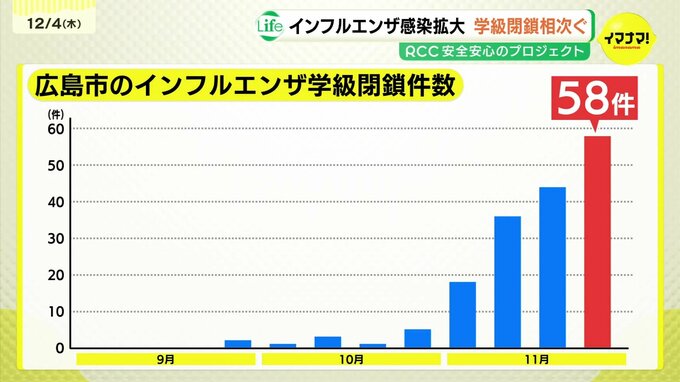 学級閉鎖なども増えていて、広島市では直近1週間で58件と、昨シーズンの同じ時期の3.6倍となっています。