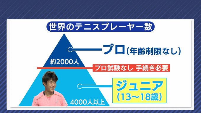 男子では、世界で2000人のプロがいます。錦織圭選手、西岡良仁選手などがそうです。