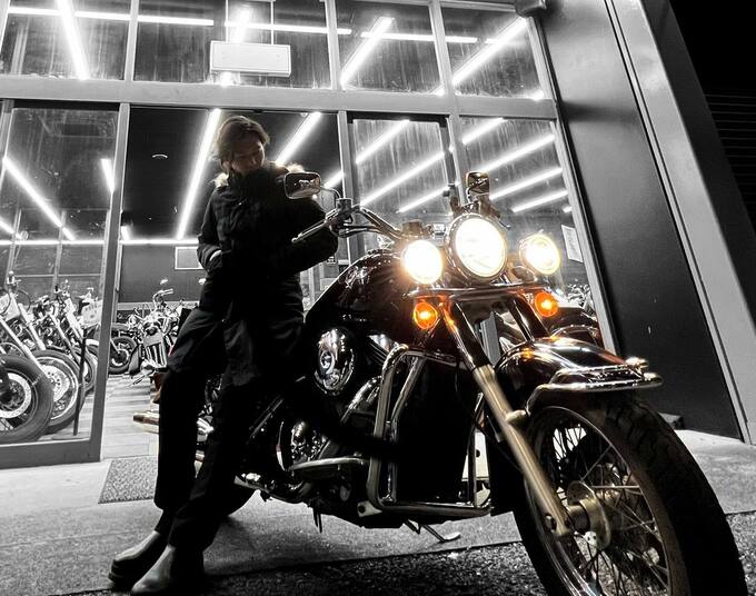 投稿された画像では、大きなバイクと一緒に佇む、岡田龍太郎さんの姿が見て取れます。