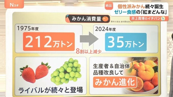 背景としては、いちごやマスカットなどライバルとなる果物が続々と登場したことが考えられるようです。一方で、みかん生産者や自治体が品種改良するなどして、みかんは進化しています。