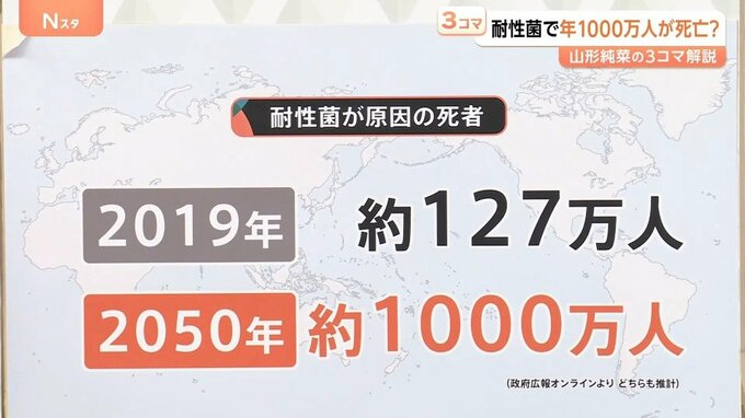 このまま何も対策をしなければ、25年後の2050年には約1000万人が耐性菌が原因で死亡する可能性もあるようです。