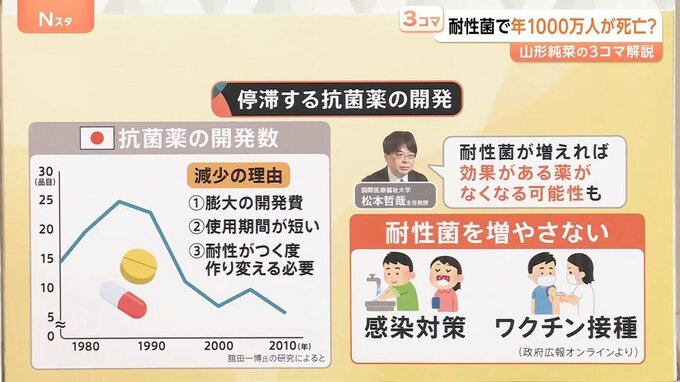 松本主任教授も「耐性菌が増えれば、効果がある薬がなくなる可能性もある」としています。ですから私たちの体の中、そして人から人への感染で耐性菌を増やさないことが大事です。