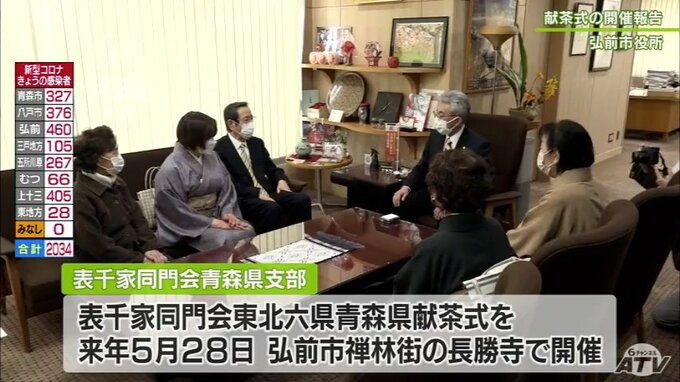 神仏に茶を献上する古式ゆかしい儀式「献茶式(けんちゃしき)」が2023年、青森県弘前市で行われるとして、表千家同門会青森県支部が櫻田宏市長に報告しました。櫻田市長を訪ねたのは、表千家同門会青森県支部の遠…