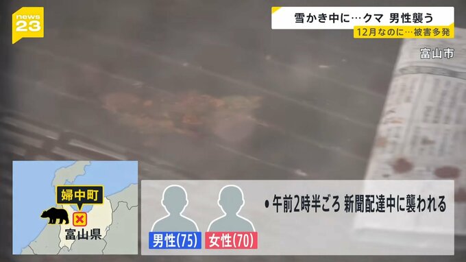 一方、富山市では、午前2時半ごろ、新聞配達をしていた70代の夫婦がクマに襲われました。夫婦は顔などにけがをしたものの、搬送されたときには意識があったということです。
