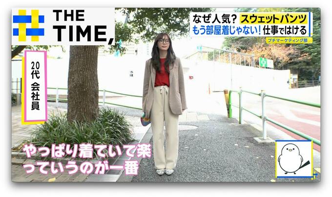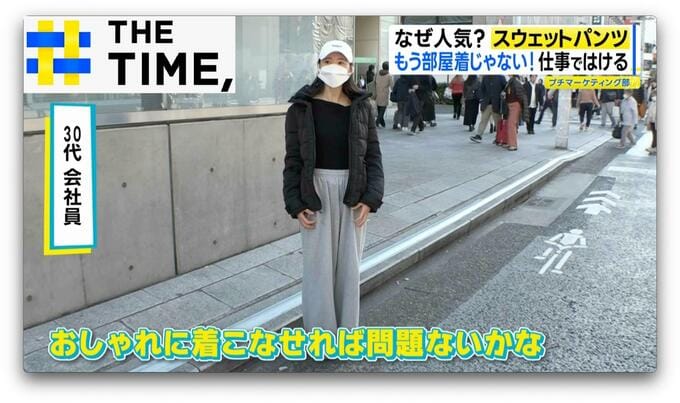外用に4本のスウェットパンツを持っているという40代の女性は、「いま流行っているというのもあるし、動きやすいから一石二鳥。“別に都心でも平気かな”」と話します。