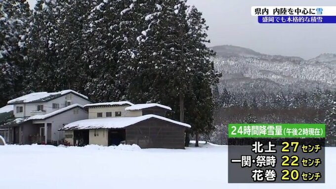 午後2時現在で24時間降雪量は北上で27センチ、一関市祭畤で22センチ、花巻で20センチなどとなっています。