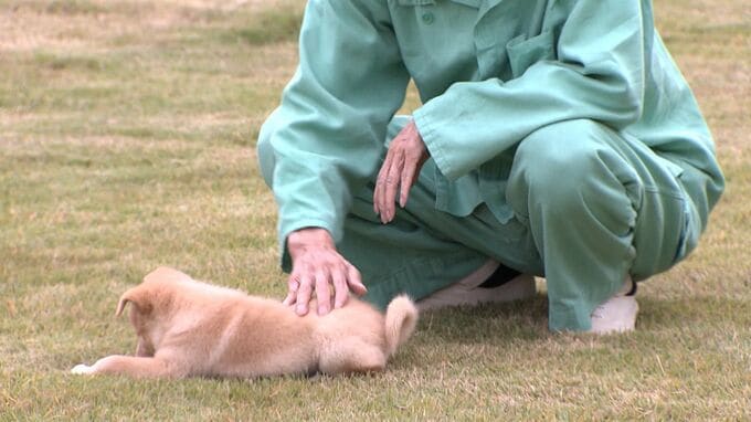 穏やかな表情で、子犬と戯れる受刑者たち。