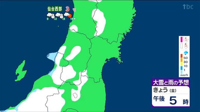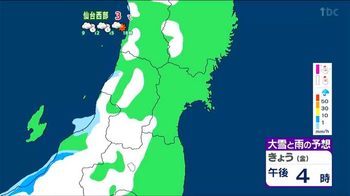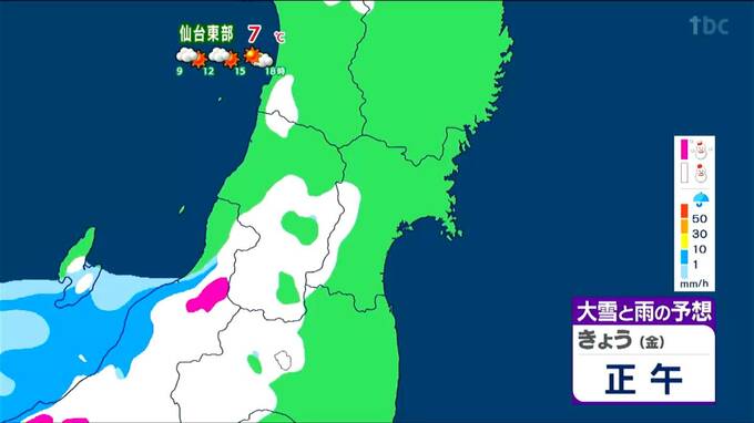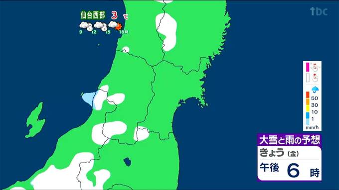 仙台エリアでは、東部は午前9時頃まで弱い雪や雨の降る可能性がありますが、その後は晴れ間が広がるでしょう。西部では昼過ぎまで雪が降りやすいですが、天気は回復傾向です。