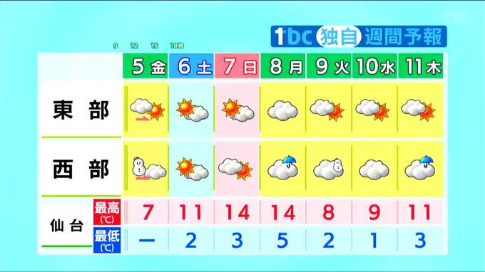 6日、7日の土日は、高気圧に覆われて2日間とも概ね晴れや曇りとなります。日曜日に北部の山沿いで少しにわか雨がありそうですが、広い範囲で降ることはない見込みです。