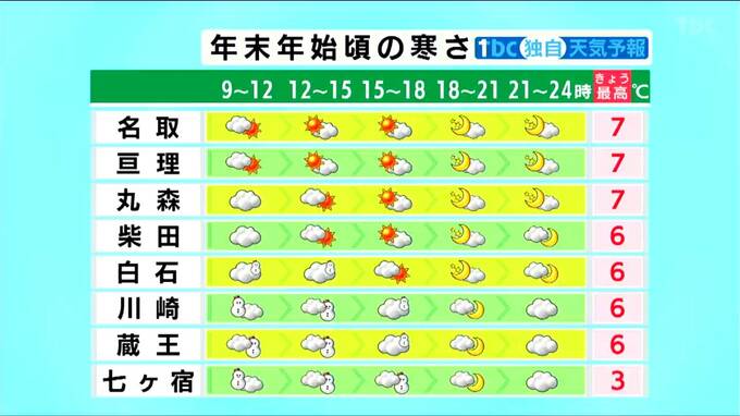 午前中は西部で雪の降りやすい状態が続くものの、午後になると冬型の気圧配置が緩んできます。これに伴い雪の範囲も次第に狭まっていく見込みです。最高気温は高いところでも7℃程度で、12月下旬並みの寒さが続くでしょう。