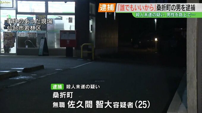 警察によりますと、佐久間容疑者は11月26日、仙台市若林区の路上で、市内に住む70代の男性の腹を包丁で刺して殺害しようとした疑いが持たれています。男性は、腹に刺し傷を負うなどして、全治13日のけがをしました。