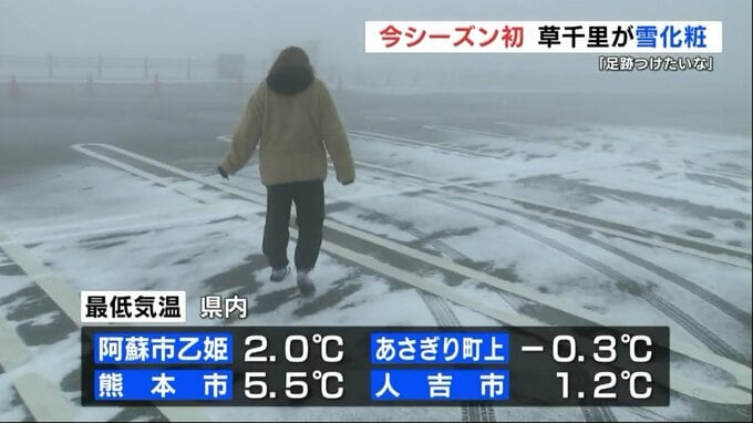 けさ(12月5日)の熊本県内は冷たい雨が降ったところもあり、標高の高い阿蘇山上では雪が降りました。標高約1100mの草千里では、明け方降ったとみられる雪でうっすらと雪化粧し、今シーズン初めての雪景色となりま…
