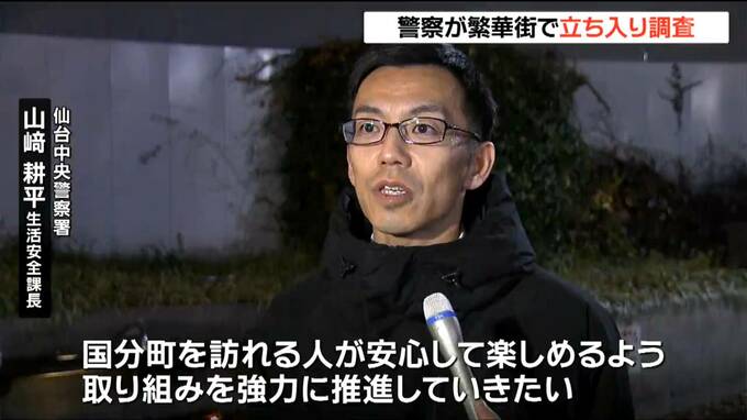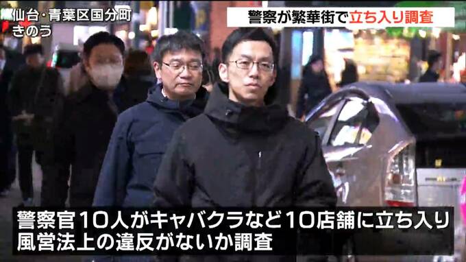 仙台市青葉区国分町では4日夜、警察官10人がキャバクラやガールズバーなどあわせて10店舗に立ち入り、風営法上のルール違反がないか調査しました。