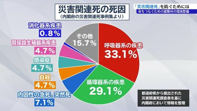内閣府が東日本大震災以降の大規模災害を調査対象にまとめた事例集によりますと、「災害関連死」の死因のうち呼吸器系または循環器系の疾患が6割以上を占めています。