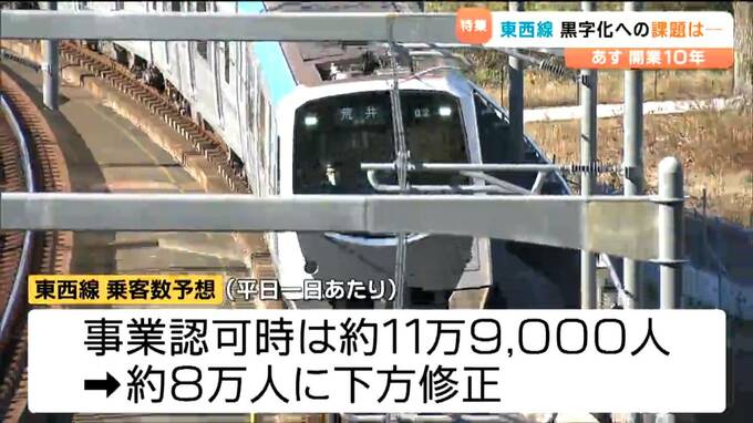 東西線の乗客数の予測は、事業認可を受けた2003年には、平日1日あたりおよそ11万9000人とされていましたが、開業3年前の2012年にはおよそ8万人に下方修正されました。