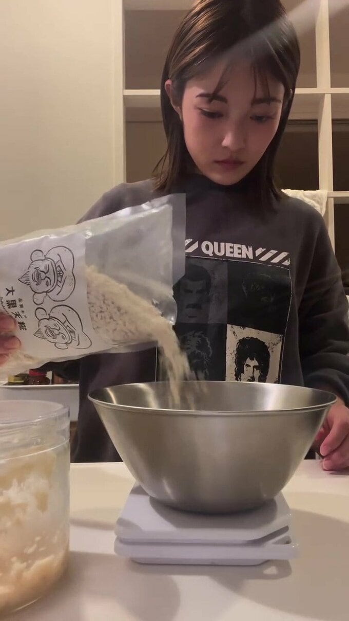 井上さんは、それらを混ぜ合わせてから、クリアなジャーの中に仕込み麹を移して、カメラの前に寄せています。井上さんがフォロワーからの「前回の塩麹足していますか?」に「足してます!」と返答。