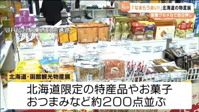 JR仙台駅の東西自由通路で5日から始まった「北海道・函館観光物産展」。北海道限定の特産品や人気のお菓子をはじめ、素材本来の味にこだわったおつまみなど約200点が並んでいます。