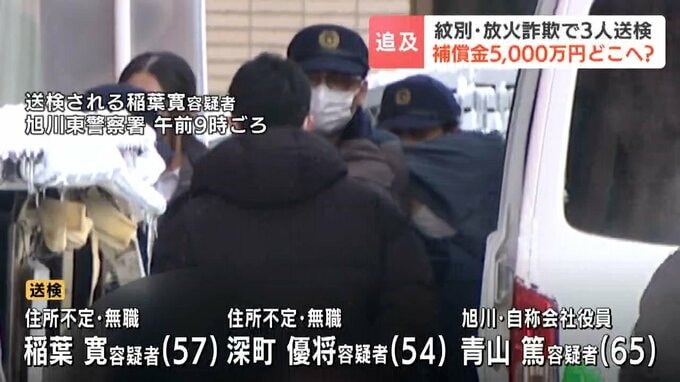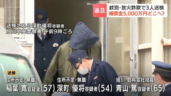 住所不定無職の稲葉寛容疑者(57)、深町優将容疑者(54)、そして旭川の自称会社役員、青山篤容疑者(65)は5日、詐欺の疑いで送検されました。