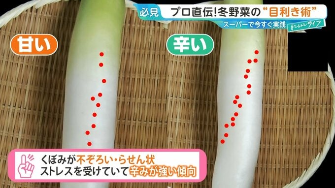 渥美さんによると、大根にある「くぼみ」が不揃いだったり・らせん状についていたりする大根は、ストレスを受けて育っているので、辛みが強い傾向にあるといいます。