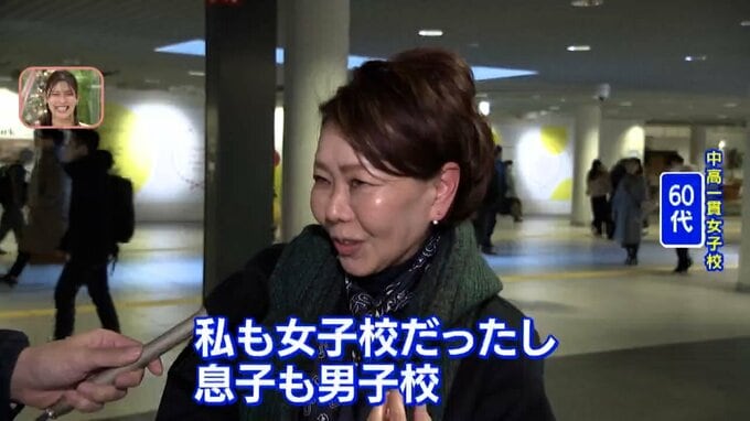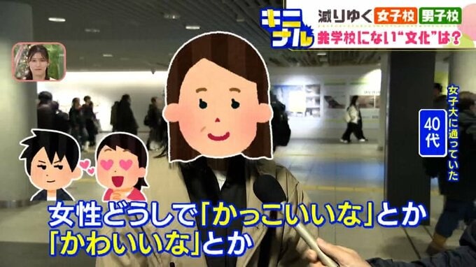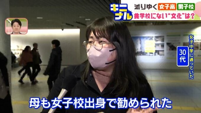 「女子大出身です。(女子大は)空気がゆっくり流れている感じがする。(女子大あるあるは?)女性同士で「かっこいいな」とか「かわいいな」とか、そういう関係に発展することはないんですけど。(共学化も増えているが?)ある程度はしかたないけれど、まだ女性の立場が弱い場面もあるので、別学(女子だけの学校)の意味はあるのではと思う」