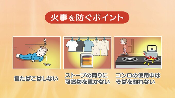 火事を防ぐポイントは寝たばこはしない、ストーブの周りに可燃物を置かない、コンロの使用中はそばを離れないことなどです。火災が起こりやすい気象条件が続きますので、一層お気をつけください。