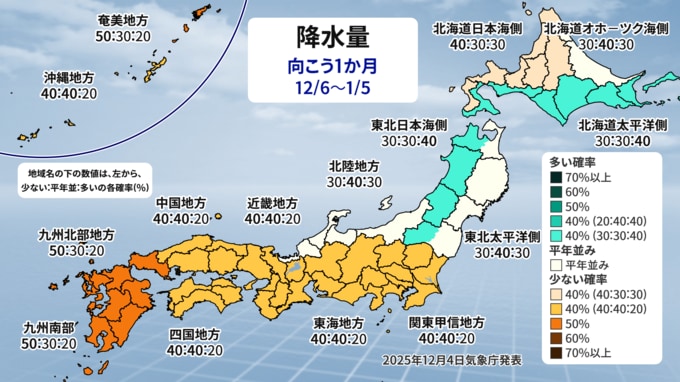 3~4週目になると、日本海側を中心に雪が降りやすくなるでしょう。年末年始は急な大雪となるおそれもありますので、移動は雪の状況をよく確認して、計画を立ててください。