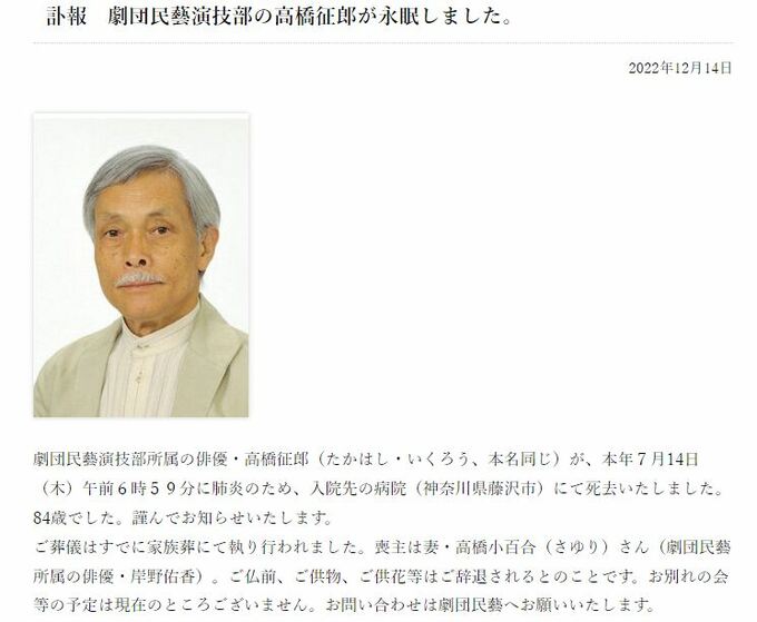 劇団民藝演技部所属の俳優・高橋征郎(たかはし・いくろう、本名同じ)が、本年7月14日(木)午前6時59分に肺炎のため、入院先の病院(神奈川県藤沢市)にて死去いたしました。84歳でした。謹んでお知らせいたします。