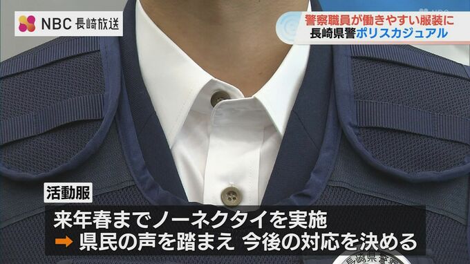 長崎県警は、街頭活動などで警察官が着用している制服についても、来年春までノーネクタイでの勤務を認め、その後の対応については、県民の意見を踏まえて決めたいとしています。
