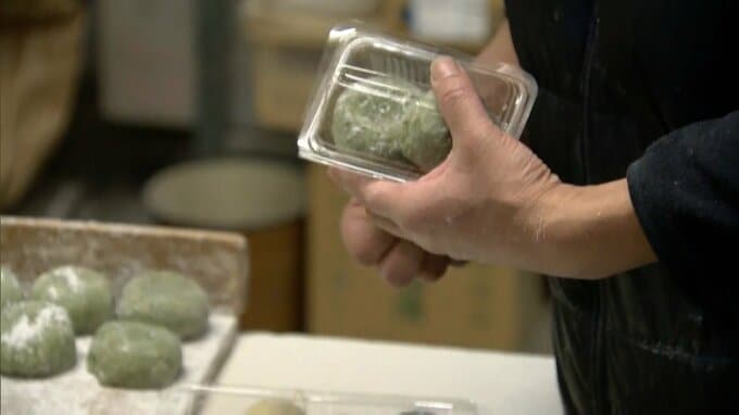店主の岩田さんは、毎朝5時から餅を機械でついて、あん餅やよもぎ餅など出来立ての和菓子を店頭に並べていきます。