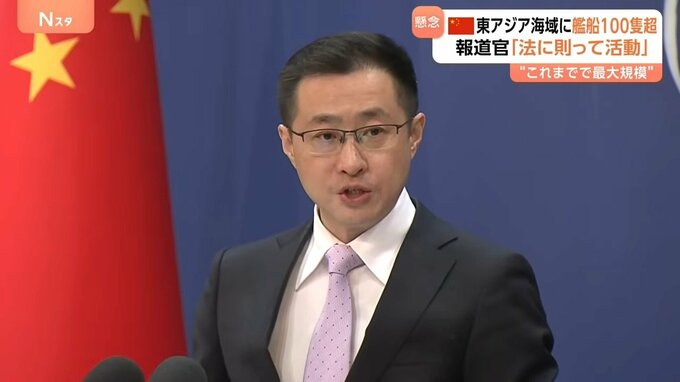 中国軍や海警局が、100隻を超える艦船を東アジアの海域に展開していると報じられたことについて、中国外務省の報道官は「法に則って活動している」と主張しました。