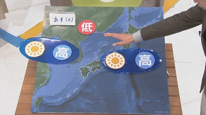 説明していきますが、まずあす土曜日は移動性の高気圧に覆われて晴れる見通しとなっています。