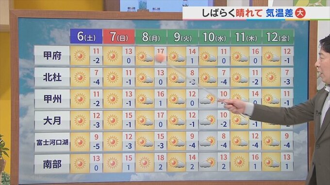 週間天気を見ていきますと、各地天気の大きな崩れはありません。ポイントとなるのが来週月曜日。寒気が弱まりますから甲府、大月は最高気温が17℃予想で、南部は18℃とポカポカ陽気となります。ただ朝と昼の気温差が大きくなります。