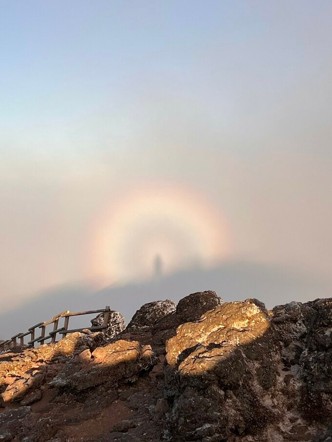 これは「ブロッケン現象」と言われる現象で、霧や雲に人の影が映り、周りに虹のような輪が見られます。