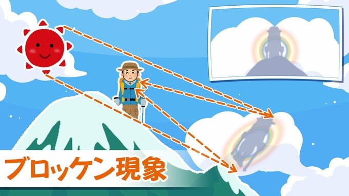 太陽を背にしているとき、影が反対側の雲や霧に映ります。影の周りに出現した七色の輪は、霧や雲の水滴で光が散乱され、虹のようになることで出現します。