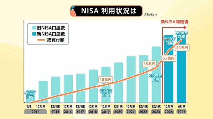 2024年度には新しい制度になり、「新NISA」となりました。金融庁によると、新NISAの口座数は2696万口座(2025年6月末)となっています。
