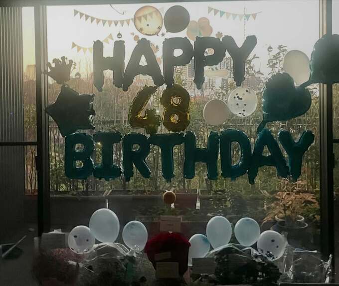 團十郎さんが投稿したのは、リビングの大きな窓に飾られたバルーン。「HAPPY 48 BIRTHDAY」という文字が朝日の光の中に浮かび上がっています。