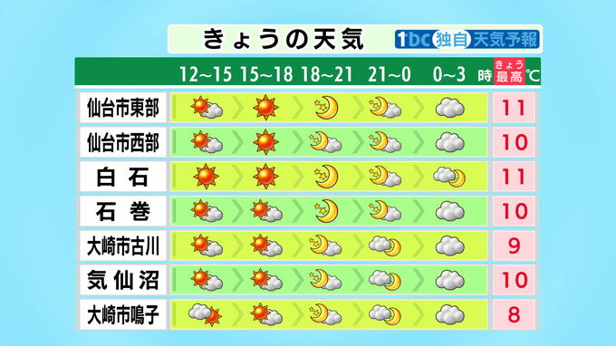 冬型の気圧配置が緩み、きょう6日の宮城県内は移動性の高気圧に覆われて南部を中心に晴れています。最高気温は10度前後まで上がり、あす7日も「行楽日和」になると見込まれています。