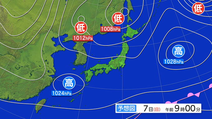 あす7日は、北海道の北の低気圧を含む気圧の谷の影響で、北部の山沿いでは何度かにわか雨やにわか雪がありそうですが、広い範囲で降ることはない見込みです。