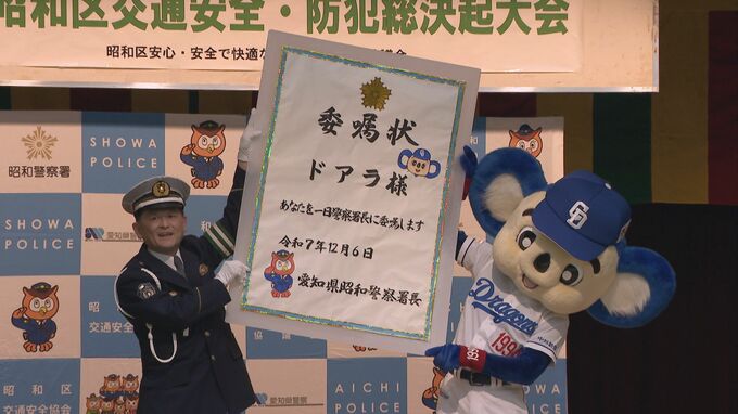 年末に向けて交通安全や防犯の意識を高めようと、6日に名古屋市昭和区で行われた決起大会に登場したのは、中日ドラゴンズのマスコットキャラクター「ドアラ」。