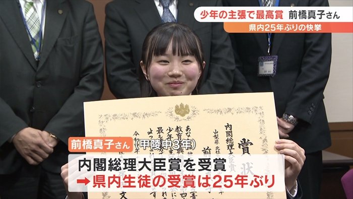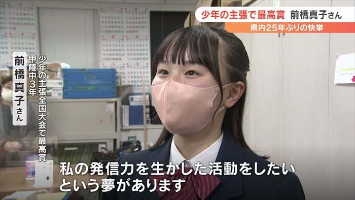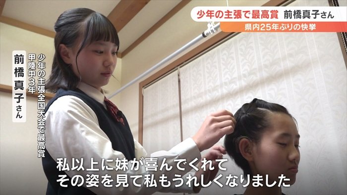 甲陵中学校3年の前橋真子さんは生まれつき難聴の妹をテーマに少年の主張全国大会で発表し、最高賞の内閣総理大臣賞を受賞しました。