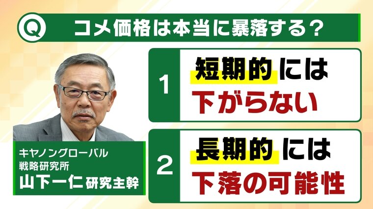 今後のコメ価格について、キヤノングローバル戦略研究所・山下一仁氏は「短期的には下がらない」と指摘。ただ、「長期的には下落の可能性」があると分析しています。