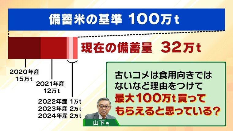 そのうえで山下氏は、「(JAが)“古いコメは食用向きではない”などの理由をつけて、最大100万t買ってもらえると思っているのでは」と分析。政府の買い上げを計算に入れ、価格を下げていない可能性があると見ています。