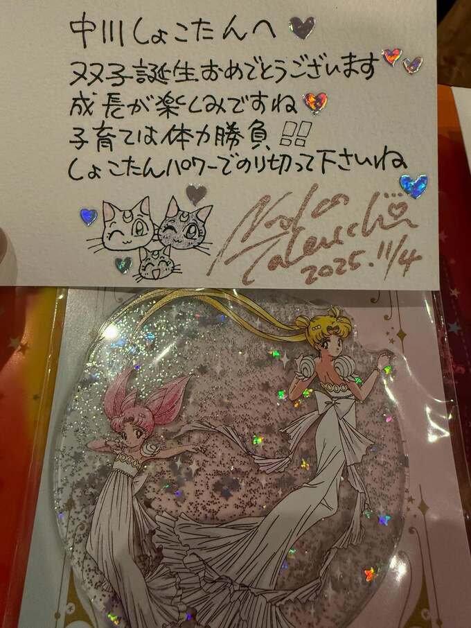 中川さんは、「信じられないミラクルロマンスな嬉しい出来事が、、!!」と綴り、「な、な、なんと セーラームーンの作者さま 武内直子さまから双子にお祝いプレゼント かわいいイラストとタオルがとどきました、、、!!!うわああああああああ」と、興奮した様子でコメントしています。