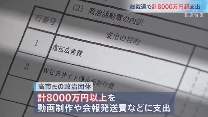 裏金事件を受けて「カネをかけない総裁選」が打ち出されていたが、総裁選前後の期間で、高市氏の政治団体があわせて8000万円以上を動画制作や会報発送費などに、小泉氏の政治団体は約5000万円をPR会社に支出していた。