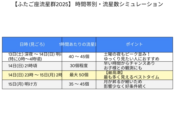 ▶14日 23時 ~ 15日 2時頃:50個程度(ここがピーク!)