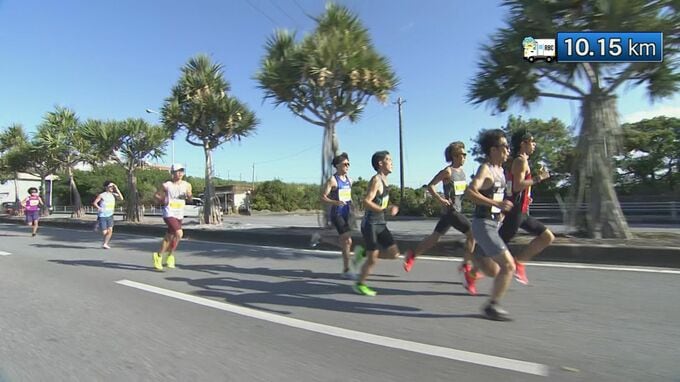 第39回NAHAマラソンは、先頭集団が10キロ地点を通過しました。通過タイムは放送車の手元の時計で33分30秒です。
