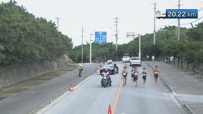 第39回NAHAマラソン、20キロ地点では先頭集団が5人に絞られてきました。県勢の濱崎達規(南城市)、黒田雄紀(千葉県)、西川朋秀(愛知県)らが1時間7分30秒(速報タイム)で20キロ地点を並んで通過しています。